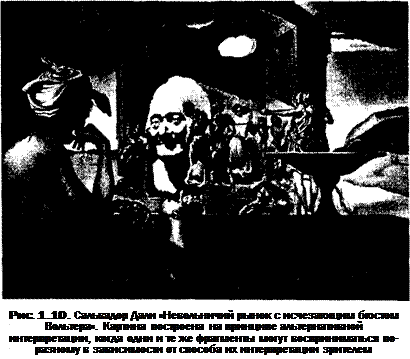 Рис. 1.9. Эффект спрятанной фигуры. На изображении 1.9, а бросаются в глаза различные элементы, такие как ромб, квадраты, но легко ли увидеть на нем фигуру 1.9,6 Специфика восприятия картин Все приведенные в этой главе изображения так или иначе связаны с проблемой «фигура-фон». Однако, возможно, большинство из них могут показаться несколько схематичными или наукообразными. Для того чтобы развеять такое впечатление, а также и для того, чтобы как-то подойти к анализу настоящих художественных произведений, вспомним картины таких мастеров, как Сальвадор Дали и Морис Эшер. Например, известная картина Дали «Невольничий рынок с исчезающим бюстом Вольтера» построена на альтернативной интерпретации (рис 1.10). Центральное место картины занимает изображение, которое может быть воспринято либо как стоящие рядом фигуры двух монахинь в черных одеждах с белыми воротничками, либо как огромный бюст Вольтера, причем лица монахинь во втором варианте восприятия становятся глазами Вольтера, а из фигур монахинь и их одежды формируются нос, подбородок и другие части бюста Вольтера. Эта картина может, таким образом, рассматриваться в качестве очень интересного, оригинального явления, представляющего собой художественное выражение научной идеи.