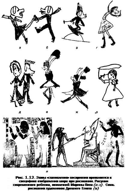 В итоге создается впечатление, что для них было важно «перечислить» главные детали, учесть их на картине. Что-то похожее имеет место и в рисунках современных детей: солнце — это круг и лучи, человек — это «палка, палка, огуречик...» и т. д. Для того чтобы убедиться в действительном сходстве рисунка современного ребенка и типичного изображения художника Древнего Египта, стоит посмотреть на рис. 1.12. На нем вы видите удивительно схожие принципы построения двух типов рисунков, что, в частности, выражается в аналогичных искажениях пропорций, поз и отдельных деталей тел. Автором рис. 1.12, а-з является современный ребенок — пятилетняя Марина Виха. Важно отметить, что стиль ее рисунков не является следствием неумения, а отражает оригинальность восприятия. Рисунки Марины отличаются удивительно точным выражением экспрессии их героев. В частности, дети-собачки, изображенные на рис. 1.12, а -ж, просто излучают оптимизм, энергию й веселье. С другой стороны, на рис. 1.12, з приведено не стилизованное, а вполне реалистичное изображение девочки, нарисованное тем же пятилетним автором. Причем на этом рисунке очень точно и лаконично показан совсем другой спектр эмоций — и поза, и выражение лица изображенной девочки свидетельствуют о ее грустном, минорном настроении. Для сравнения на рис 1.12, и приведены стилизованные изображения работающих людей. На рисунках хорошо видны принципы стилизации: сочетание лиц* показанных в профиль, и фигур — в анфас, а также, что особенно интересно, типичное для таких барельефов изображение людей с головами птиц и животных. В данном случае таковым является птицеголовое существо, обрабатывающее каменную статую. Однако, как бы то ни было с детьми, современный художник владеет техникой изображения полностью. И если Пикассо рисует «Девочку на шаре» именно с такими пропорциями, то можно быть уверенным в том, что именно такой вариант внешнего мира он предлагает зрителю. И зритель платит за картины великих художников астрономические деньги не потому, что эти картины точно передают реальность окружающего, а потому, что эти картины открывают перед ним новые миры или, более точно, дают новые интерпретации набора яркостей и цветов, проецируемых на наши глаза. Фиксируем этот вывод: на сетчатку наших глаз не попадает ничего, кроме точек разной яркости