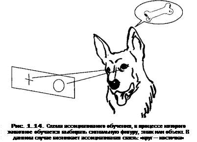 Рис. 6.3. Схема классического (павловского) условного рефлекса — одного из базовых процессов ассоциативного обучения у животных и человека: а — блок безусловного (врожденного, генетически запрограммированного) реагирования. Нейронные связи устроены так, что в ответ на некоторые существенные для выживания сигналы появляется немедленная автоматическая реакция; пример 1: вспышка света — зажмуривание, пример 2: всем известный коленный рефлекс; б — блок условного рефлекса. Формирование временной связи после нескольких сочетаний ранее индифферентного (не вызывающего ответ) сигнала и сигнала, вызывающего безусловный ответ; пример: зажмуривание глаз в ответ на звонок, t,, t2 — моменты предъявления сигналов, t, = t2 . Двойная стрелка — образование временной связи, что соответствует «проторению» связи между нейронами схему типа «стимул — реакция», а точнее — «вполне определенный стимул — вполне определенная реакция». (Интересно отметить, что и термин, и само понятие «рефлекс» были введены Р. Декартом еще в первой половине XVII века, но развитию науки понадобилось 300 лет для того, чтобы сделать следующий шаг — сформулировать понятие условного рефлекса.) Схема условного реагирования включает в себя кроме блока безусловного рефлекса механизм формирования ассоциативной связи между появлением безусловного сигнала и некоторого, вообще говоря, любого условного сигнала. В качестве такового могут быть использованы свет, звук, изображение или любой другой индифферентный стимул, т. е. любой стимул, ранее никак не связанный (с точки зрения животного) с данной безусловной реакцией. Определяющим условием формирования такого ассоциативного обучения является непосредственное предъявление условного (ранее индифферентного) стимула перед безусловным. По установленному И. П. Павловым закону, условный сигнал должен предшествовать безусловному. Причем увеличение временного интервала между условным и безусловным сигналами резко увеличивает сложность выработки условного рефлекса. Скорость и устойчивость условной ассоциативной связи зависит также от числа сочетаний во времени условного и безусловного сигналов. В результате формирования условного рефлекса безусловная реакция следует сразу после предъявления условного раздражителя. Скажем, животное направляется к месту кормления сразу же после появления условного раздражителя, например вспышки света, не дожидаясь появления пищи. Типичная схема экспериментов с использованием «собаки Павлова» заключалась в наружном выведении слюнных или желудочных протоков животного, что давало возможность точно подсчитывать количество слюны, выделявшейся на условный сигнал, например звонок, после нескольких сочетаний «звонок — пища» (рис. 6.4). Важно отметить, что условный рефлекс представляет собой универсальную форму зачаточной интеллектуальной деятельности и обучения. В той или иной форме он присутствует практически у всех животных, включая беспозвоночных, насекомых и рыб. Например, выработка условного рефлекса у пчел может быть легко достигнута после нескольких повторных предъявлений сладкого сиропа на бумажке определенного цвета. После недолгого периода обучения пчелы выбирают данный цвет из набора всех остальных. У более сложно организованных животных, таких, как птицы и позвоночные, легко у