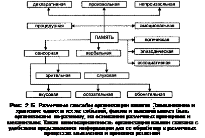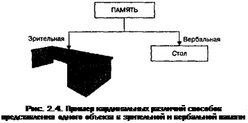 всю деятельность человека. Возможно, эта «вездесущность» памяти отчасти послужила основой предположений о том, что в принципе человек может вспомнить все или почти все из того, что происходило с ним в течение жизни (рис. 2.3). Виды памяти Возможно, это покажется удивительным или неожиданным, но при внимательном рассмотрении выясняется, что память человека не представляет собой системы хранения различных кусков информации, не зависимой от вида или типа информации. Способы хранения информации в человеческой памяти и, по-видимому, в памяти других живых существ тесно связаны и во многом определяются теми функциями, операциями и процедурами, для которых эта память предназначена. Процессы запоминания и хранения информации, таким образом, не являются нейтральными, они зависят от способа работы с этой информацией. Одна и та же информация может запоминаться разными способами, храниться в разных видах. При этом способы и виды хранения напрямую определяются тем, каким образом эта информация будет обрабатываться (рис. 2.4). Впрочем, нечто подобное имеет место и в компьютерных системах, где информация может быть записана не только с помощью различных шрифтов, но и представлена в виде схем, образов, звуков и т. д. Особенность вопроса о видах памяти состоит в том, что при их описании каждый раз следует проводить различие между собственно видами