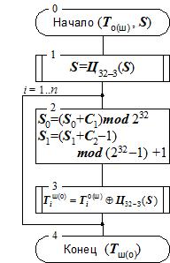 Шаг 0. Определяет исходные данные для основного шага криптопреобразования: N –преобразуемый 64-битовый блок данных, в ходе выполнения шага его младшая (N1 ) и старшая (N2 ) части обрабатываются как отдельные 32-битовые целые числа без знака. Таким образом, можно записать N=(N1 ,N2 ). X – 32-битовый элемент ключа; Шаг 1. Сложение с ключом. Младшая половина преобразуемого блока складывается по модулю 232 с используемым на шаге элементом ключа, результат передается на следующий шаг; Шаг 2. Поблочная замена. 32-битовое значение, полученное на предыдущем шаге, интерпретируется как массив из восьми 4-битовых блоков кода: S=(S0 ,S1 ,S2 ,S3 ,S4 ,S5 ,S6 ,S7 ). Далее значение каждого из восьми блоков заменяется на новое, которое выбирается по таблице замен следующим образом: значение блока Si заменяется на Si -тый по порядку элемент (нумерация с нуля) i-того узла замен (т.е. i-той строки таблицы замен, нумерация также с нуля). Другими словами, в качестве замены для значения блока выбирается элемент из таблицы замен с номером строки, равным номеру заменяемого блока, и номером столбца, равным значению заменяемого блока как 4-битового целого неотрицательного числа. Шаг 3. Циклический сдвиг на 11 бит влево. Результат предыдущего шага сдвигается циклически на 11 бит в сторону старших разрядов и передается на следующий шаг. На схеме алгоритма символом 11 обозначена функция циклического сдвига своего аргумента на 11 бит в сторону старших разрядов. Шаг 4. Побитовое сложение: значение, полученное на шаге 3, побитно складывается по модулю 2 со старшей половиной преобразуемого блока. Шаг 5. Сдвиг по цепочке: младшая часть преобразуемого блока сдвигается на место старшей, а на ее место помещается результат выполнения предыдущего шага. Шаг 6. Полученное значение преобразуемого блока возвращается как результат выполнения алгоритма основного шага криптопреобразования. Базовые циклы: - цикл выработки имитовставки (0123456701234567) Для каждого элемента данных выполняется основной шаг криптографического преобразования с элементами ключа, порядок Базовые циклы построены из основных шагов криптографического преобразования. Существует всего три базовых цикла, различающиеся порядком следования ключевых элементов: - цикл зашифрования (01234567012345670123456776543210) - цикл расшифрования (01234567765432107654321076543210) следования которых приведен выше. Для циклов шифрования левая и правая половины блока меняются местами, для цикла выработки имитовставки – нет. Предусматривается три режима шифрования данных: простая замена, гаммирование, гаммирование с обратной связью и один дополнительный редим формирования имитовставки.