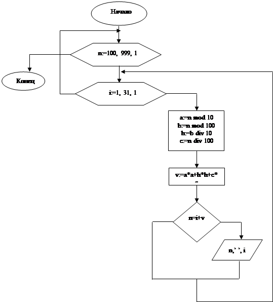 3.3.4 ПрограммаProgramdata; Uses crt; Var i, n, a, b, c, v, h: integer; Begin Clrscr; For n: =100 to 999 do for i: =1 to 31 do begin a: =n mod 10; b: =n mod 100; h: =b div 10; c: =n div 100; v: =a*a+h*h+c*c; if n=i+v then writeln (n,' ', i); end; readln; end. 3.3.5 Результат работы программы