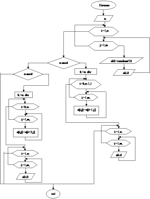 3.6.3 Блок-схема 3.6.4 ПрограммаVar a: array [1. .100,1. .100] of integer; i,j,m,n,k: integer; begin writeln ('Введите разм. мас'); readln (n,m); randomize; for i: =1 to n do begin for j: =1 to m do begin a [i,j]: =random (100); write (a [i,j]: 3); end; writeln; end; writeln ('После удаления'); if n mod 2<>0 then begin k: =n div 2+1; For i: =k to n-1 do for j: =1 to m do a [i,j]: =a [i+1,j] ; for i: =1 to n-1 do begin for j: =1 to m do write (a [i,j]: 3); writeln; end; end else if n mod 2=0 then begin k: =n div 2; For i: =k to n-2 do for j: =1 to m do a [i,j]: =a [i+2,j] ; for i: =1 to n-2 do begin for j: =1 to m do write (a [i,j]: 3); writeln; end; end; readln; end. 3.6.5 Результат работы программы