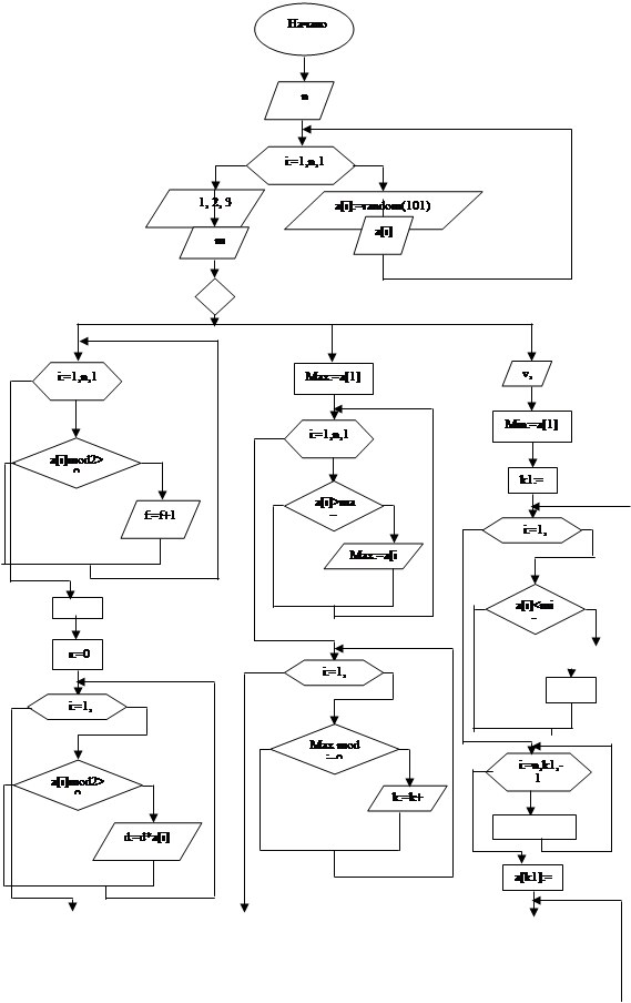 3.7 Решение задачи3.7.1 Постановка задачиДан одномерный массив целых чисел произвольной длины. Заполните массив случайными числами до 100. Используя, оператор выбора, создайте меню, в котором при нажатии на клавишу производятся следующие действия: 1 - вычислить среднее геометрическое четных элементов массива; 2 - найти количество делителей максимального числа; 3 - вставить в массив два элемента с данными значениями: первый после минимального элемента, второй - перед минимальным элементом. 3.7.2 Таблица идентификаторов