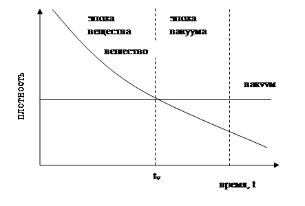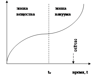 Рисунок 2.3 – Изменение расстояний в реальном мире. По свойству экспоненциальной функции, в таком экспоненциально расширяющемся мире скорость взаимного разбе-гания тел пропорциональна расстоянию между ними. Но тогда в законе Хаббла V = HR, постоянная Н будет независимой не только от направлений и расстояний в пространстве, но также и от времени: Н = с/А. Космологической длине А отвечает время А/с ~ 10 млрд. лет. Близость по порядку величины к современному возрасту мира — не случайное совпадение. Обратимся теперь не к будущему, а к прошлому Вселенной. Вакуум доминировал в мире не всегда. Его плотность не меняется со временем, тогда как плотность темного вещества падает при расширении мира и, значит, растет назад — в прошлое. Плотность вещества меняется обратно пропорционально квадрату возраста мира. Все это означает, что антитяготение вакуума было несущественно в достаточно отдаленном прошлом. В ранней Вселенной безраздельно господствовало всемирное тяготение невакуумных компонент космической среды. А эпоха антитяготения наступила только при возрасте мира в 6-8 миллиардов лет: в этот момент плотность темного вещества упала до значения плотности вакуума (см. рис. 2.4).