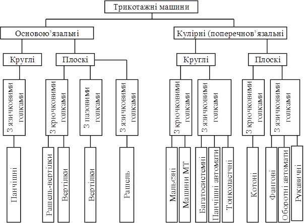 Рис. 1.1. Класифікація трикотажних машин Основні робочі органи трикотажних машин: петлеутворюючий (в’язальний) механізм, механізм живлення (подачі ниток) і відтяжний механізм (товаровідвід). Петлеутворюючий механізм має голковиці з голками, платини, прес (для крючкових голок), нитководії і інші елементи. Платини (пластинки, що мають складну форму) згинають нитки в петлі і пересувають їх вздовж стрижня голки (якщо голки нерухомі) або утримують (якщо голки рухомі) і розміщуються на машинах зазвичай по одній в проміжках між голками. Прес є призмою, пластинкою або диском, які, натискаючи на гачок, перешкоджають попаданню петлі під нього. Механізм живлення під час прокладання нитки на голки забезпечує певний і постійний натяг нитки за допомогою нитконаправлювачів, гальм, нитковідтягувачів і інших. пристосувань. Є механізми живлення, в яких дозується (відміряється) довжина нитки для кожного петельного ряду. Живлення пряжею може здійснюватися подачею окремих ниток (поперечнов’язальні машини) і груп ниток (основов’язальні машини). Відтяжний механізм служить для відведення від голковиць готового трикотажу з постійним натягом. Може бути вантажним (натягнення створюється під дією ваги товоровідвідної системи або вантажу) або відтяжним (відтягування здійснюється за допомогою валів). Процеси в’язання на трикотажних машинах автоматизуються за допомогою механізмів, що контролюють безперервність живлення, постійність натягу ниток, справність голок, наявність дефектів (спущених петель) і т.д. При в’язані штучних виробів використовують механізми, що виконують перенесення петель при зміні ширини полотна, створюють роздільні петельні ряди, вводять підсилювальну нитку, змінюють щільність в’язання, вив’язують складні об’ємні форми у виробах (панчохи, рукавички) і ін. Розроблені електронні пристрої управління роботою трикотажних машин, механізми відбору (введення в роботу) голок в’язанні рисунчастих і ажурних переплетень. Для в’язання штучного хутра використовують круглі трикотажні машини, що мають в кожній петлеутворюючій системі мініатюрні чесальні апарати. За допомогою цих апаратів в петлі вплутуються пучки довгих волокон, утворюючи ворс. Продуктивність трикотажної машини. (млн. петель в 1 хв.): основов’язальних –до 3,74; круглотрикотажних – до 5,94; круглопанчішних автоматів –до 1,44. Широкого поширення набули трикотажні машини, що виготовляються у ФРН, США, Великобританії, ФРГ (рис. 1.2). Подальший розвиток трикотажних машин. спрямований на підвищення класу машин, збільшення числа петлеутворюючих систем і автоматизацію процесу в’язання. Крім промислових трикотажних машин, випускаються також побутові ручні в’язальні машини і апарати. Основні вузли ручних машин: петлеутворюючі елементи (язичкові голки і платини), каретка, лічильник рядів. Каретка управляє роботою голок і платин у момент в’язання і переміщається вручну по направляючих рейках. В’язальні апарати мають відтягуючі гачки, гребінку з штирями, на яку вручну навішують петлі, і лінійки, за допомогою яких переміщаються гачки і регулюється щільність в’язання.