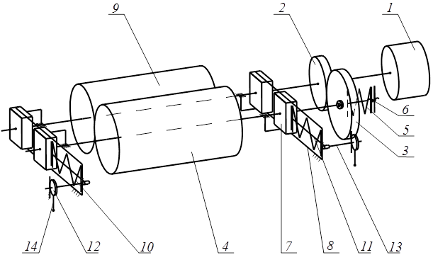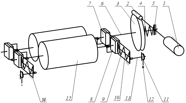 Рис. 1.10. Кінематична схема механізму товаровідтягування (варіант 1) Працює механізм наступним чином. Від електричного двигуна 1 передача здійснюється через черв’ячну передачу (черв’як 2 і черв’ячне колесо 3) та муфту тертя (на схемі не показана), що притискається пружиною 4, на ведучий вал відтягування 6. Зусилля притискання регулюється за допомогою гайки 5. Сила притискання притискного (веденого) вала 15 до ведучого вала 6, створюється за допомогою пружин 9. Для перезаправлення тканини ручки 12 повертають. При цьому повертається ексцентрики 11, які через гвинт-вісь 13 переміщують тягу 10 з упором, що стискає пружини притискання 9. При цьому між ведучим і веденим валом утворюється зазор. Після заправлення полотнини ручка повертається у начальне положення, ексцентрик повертається на малий радіус. При цьому тяга звільняє пружину. Пружина звільняється і припускає притискний вал до ведучого. Регулювання механізму: 1. Частота обертання двигуна регулюється зміною сили струму. При цьому регулюється також швидкість відтягування. 2. Сила тертя фрикційної передачі від черв’ячного колеса 3 до вала 6 регулюється з допомогою гайки 5 та пружини 4. 3. Сила притискання притискного вала 15 до ведучого валу 6 забезпечується пружинами притискання 9. 4. Заправку трикотажу забезпечують при зазорі між валами 6 та 15, який отримують при повороті ручок 12 з ексцентриками 11 та стискання пружин притискання 9 веденого вала до ведучого. Варіант 2. Механізм товаровідтягування (рис. 1.11) включає електропривод (двигун) 1, циліндричну зубчасту передачу, що складається з зубчастих коліс 2, 3, муфту тертя (на схемі не показана), ведучий вал 4 відтяжки та ведений (притискний) вал 9, корпус 8 з повзунами 7 для установки валів. Ведений (притискний вал 9 відтяжки встановлений з допомогою двох кронштейнів (коромисел) і осі в повзунах 7, що встановлені в корпусі 8 механізму товаровідтягування. Ведений вал 9 притискається до ведучого валу 4 за допомогою пружин 10. На одному з кронштейнів – коромисел встановлено регулювальний гвинт. На корпусі на рівні гвинта встановлено мікроперемикач струму двигуну. Працює механізм наступним чином. Від електричного двигуна 1 передача здійснюється через циліндричну зубчасту та фрикційну передачу на ведучий вал 4 відтягування. За рахунок пружини 5 створюється сила притискання веденого вала 9 до ведучого 4, яка регулюється гайкою 6. При роботі машини можливе збільшення сили натягу трикотажу. При цьому притискний вал 9 відхилиться і за допомогою спеціального гвинта натискне на кнопку мікровимикача струму. Це приведе до короткочасного вимкнення електродвигун і сила відтяжки зменшиться. Вал притискний 9 повернеться в початкове положення і включиться мікроперемикач. Електродвигун знову запрацює.