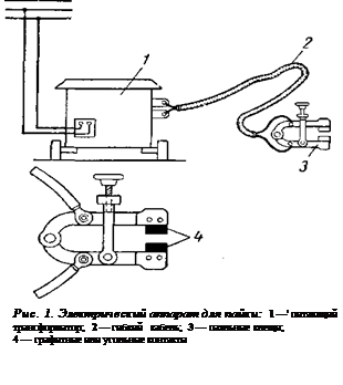 Более универсальными электрическими аппаратами для пайки являются аппараты, работающие по способу горячего контакта между угольным или графитным электродом и изделием. Такой аппарат состоит из двух основных частей: понижающего трансформатора, подвижного или стационарного, и клещей для пайки, соединяемых с зажимами трансформатора гибкими проводами, которые могут иметь значительную длину, что придает установке гибкость и универсальность применения. Понижающий трансформатор изготовляется по типу трансформаторов для электрических контактных сварочных машин. Первичная обмотка трансформатора секционирована, что позволяет регулировать напряжение вторичной обмотки и рабочую силу тока путем переключения витков первичной обмотки, как в контактных машинах. Первичная обмотка трансформатора включается в электрическую цепь контактором с кнопочным управлением. Кнопка включения помещена на ручке паяльных клещей (рис.1) или вынесена в форме отдельной переносной педали. Рабочие токоподводящие контакты паяльных клещей выполнены в форме сменных призматических блоков — брусков из электродного угля или графита. Детали зажимают винтом, подогревающий ток включают кнопкой на ручке клещей. Рабочие токи для пайки обычно находятся в пределах 500—1000 а. Паяльные клещи присоединяются ко вторичной обмотке трансформатора гибкими Паяльные клещи присоединяются ко вторичной обмотке трансформатора гибкими проводами достаточного сечения и требующейся длины (обычно до 2-Зм). Для пайки меди обычно пользуются фосфорно-медными припоями, для пайки стали — серебряными припоями. Фосфорно-медные припои для пайки черных металлов непригодны. Индукционная пайка токами высокой частоты. В последнее время быстро развивается и начинает находить широкое промышленное применение новый весьма эффективный способ пайки токами высокой частоты. Метод основан на нагреве металла вихревыми токами, которые создаются переменным магнитным полем высокой частоты. Переменное магнитное поле, в свою очередь, создается намагничивающими обмотками — индукторами. При приближении индуктора к поверхности изделия возникают вихревые токи в зоне металла, подвергающейся магнитному воздействию индуктора. Действие индуктора тем сильнее, чем меньше расстояние между индукторами и нагреваемым металлом. Для возможного уменьшения расстояния применяют индукторы с изоляцией из тугоплавкой эмали; в этом случае расстояние между индуктором и нагреваемым металлом может быть снижено до 0,3—0,5 мм. Нагревание токами высокой частоты сосредотачивается в очень тонком поверхностном слое металла, в котором возникают вихревые токи. Нижележащие слои нагреваются вследствие теплопроводности. Малый объем разогреваемого металла позволяет вести нагрев весьма быстро, с высоким к.п. д. Процесс пайки отличается чистотой, удобством выполнения, легко поддается механизации и может быть хорошо приспособлен к условиям массового производства однотипных деталей. Все эти преимущества нагрева токами высокой частоты обеспечивают возможность широкого промышленного использования его при пайке. Препятствием к применению токов высокой частоты пока служит довольно высокая стоимость и некоторая сложность установок для получения этих токов. Пайка в печах. Нагрев под пайку может производиться также 