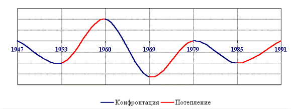 Рис.1 Периоды конфронтации и потепления «холодной войны» [9] 2.1 Начало «холодной войны», 1946-1953 гг. После окончания Второй Мировой войны руководство СССР делало всё возможное, чтобы в странах Центральной и Юго-Восточной Европы к власти пришли просоветские силы, прежде всего, коммунистические партии. СССР стремился использовать систему коллективной безопасности для расширения своего могущества. Это было замечено странами Запада и вызвало тревогу. Кроме того, после вывода из Европы основной части американских войск, СССР превратился в доминирующую военную силу в континентальной Европе. Всё благоприятствовало планам советского руководства. Поиск ответа на советский вызов шёл и в государственном департаменте США. Важную роль в этом сыграл американсий дипломат, специалист по России Джордж Кеннан. В феврале 1946 года, работая в посольстве США в Москве, он в телеграмме в Вашингтон изложил основные принципы политики "сдерживания". По его мнению, правительству США надлежало жестко и последовательно реагировать на каждую попытку СССР расширить сферу своего влияния. Далее, для того чтобы успешно противостоять проникновению коммунизма, странами Запада следует стремиться к созданию здорового, благополучного, уверенного в себе общества. Политика "сдерживания" рассматривалась им как способ предотвращения войны и не была нацелена на нанесение СССР военного поражения. Таким образом американская политика в отношении СССР приняла новое направление: был взят курс на ограничение распространения коммунистической идеологии в странах западной Европы и поддержки Советским союзом коммунистических движений.