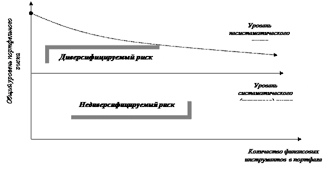 Рис.1. Зависимость уровня несистематического и общего портфельного риска от количества финансовых инструментов инвестирования Результатом этого этапа формирования портфеля является обеспечение достижения минимально возможного уровня его риска при заданном уровне ожидаемого инвестиционного дохода. 4. Совокупная оценка сформированного портфеля по соотношению уровня доходности и риска позволяет оценить эффективность всей работы по его формированию. Уровень доходности портфеля рассчитывается по следующей формуле: УДп = УДi х Уi, где: УДп - уровень доходности инвестиционного портфеля; УДi - уровень доходности отдельных финансовых инструментов в портфеле; Уi - удельный вес отдельных финансовых инструментов в совокупной стоимости инвестиционного портфеля, выраженный десятичной дробью. Уровень риска портфеля рассчитывается по следующей формуле: УРп = УСРi х Уi + УНРп, где: УРп - уровень риска инвестиционного портфеля: УСРi - уровень систематического риска отдельных финансовых инструментов (измеряемый с помощью бета-коэффициента); Уi - удельный вес отдельных финансовых инструментов в совокупной стоимости инвестиционного портфеля, выраженный десятичной дробью; УНРп - уровень несистематического риска портфеля, достигнутый в процессе его диверсификации. Результатом этого этапа оценки портфеля является определение того, насколько удалось снизить уровень портфельного риска по отношению к среднерыночному его уровню, сформированному при заданном уровне доходности инвестиционного портфеля, в условиях функционирования нашего фондового рынка эта оценка должна быть дополнена и показателем уровня ликвидности сформированного портфеля. Инвестиционный портфель, который полностью отвечает целям его формирования, как по типу, так и по составу включенных в него финансовых инструментов, представляет собой «сбалансированный инвестиционный портфель». Управление инвестиционным портфелем включает в себя планирование, анализ и регулирование состава портфеля для достижения поставленных перед портфелем целей при сохранении необходимого уровня его ликвидности и минимизации расходов связанных с ним. В условиях дефицитной инфляционной экономики с падающим объемом производства целями портфельных инвестиций являются: - сохранность и приращение капитала; - приобретение ценных бумаг, которые могут быть использованы для расчетов; - доступ через ценные бумаги к определенным услугам, правам, продукции; - расширение сферы влияния. Объектом портфельного инвестирования являются как фондовые ценные бумаги (акции и облигации акционерных обществ и предприятий, а также производные от них ценные бумаги, государственные облигации и долговые обязательства), так и коммерческие ценные бумаги - векселя, депозитные сертификаты банков. Принято различать два вида стратегии в финансовых инвестициях: - пассивная стратегия, целью которой является обеспечение стабильного и устойчивого дохода на уровне, близком к среднерыночному; - агрессивная стратегия направлена на максимальное использование возможностей получения дохода от рыночного колебания курсов; для успешного проведения агрессивной стратегии необходимо располагать серьезной аналитической базой, обеспечивающей объективную оценку текущего состояния финансового рынка и составление адекв