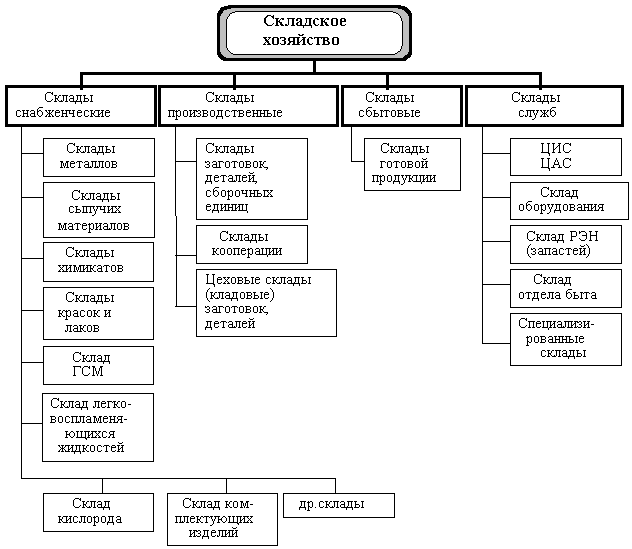 Рис. 1. Структура складского хозяйства Организация работ в складском хозяйстве определяется рядом факторов. Общие факторы для всех складов: 1. Вид груза и условия его поступления на склад (так, например, организация работы по выгрузке пакетированных и непакетированных грузов различна по содержанию); 2. Величина партии грузов, поступающих единовременно на склад (принятие на склад партии грузов большей, чем в среднем за смену или сутки, требует дополнительных организационных мероприятий по разгрузке транспортных средств в установленные сроки); 3. Режим работы базы (организация работ на базе, работающей в одну смену, отличается от организации работ на базе, работающей в две или в три смены); 4. Тип складского здания или сооружения – открытая площадка, навес, закрытое помещение; 5. Способ отпуска и доставки материалов – крупными или мелкими партиями, в вагонах или автомобилях, централизованно или путем само вывоза. Непременным условием рациональной организации работ на складе является наличие номенклатуры-ценника материалов, списка должностных лиц, которым предоставлено право разрешать отпуск материалов и образцов их подписей, графика отпуска материалов, должностных инструкций и форм учетной документации. В процессе выгрузки и приемки материалов следует избегать излишнего их накопления в местах приема и не допускать количественных и качественных потерь. Площадки для выгрузки и приемки продукции должны быть оснащены приборами для определения фактического количества и контроля качества материалов, инструментом для вскрытия тары и упаковки. До начала выгрузки к местам выгрузки должны быть поданы оборудование и приспособления, используемые при выгрузке: соединительные мостки для проезда погрузчика из склада в вагон, внутрискладская тара, грузозахватные приспособления. Своевременное оснащение мест выгрузки сократит время выполнения этой операции. Для грузов, выгружаемых в ночное время или же прибывших без сопроводительных документов в поврежденной таре, в зоне выгрузки и приемки должно быть отведено и оборудовано место для временного хранения. Для рациональной организации размещения и хранения продукции на складе ее необходимо сгруппировать с учетом объемно-весовых характеристик и физико-химических свойств. Эта работа выполняется с целью образования групп продукции примерно одинаковых по указанным параметрам. Для хранения каждой группы продукции выделяется отдельный участок в зоне хранения, оснащенный соответствующим оборудованием для складирования и хранения. Размещение материалов в зоне хранения склада должно осуществляться таким образом, чтобы отпуск их со склада производился в порядке поступления. Отклонения от этого принципа приводят к ухудшению качества продукции. Размещение продукции в зоне хранения должно обеспечивать материальные затраты времени на укладку продукции, снятие ее с мест хранения и доставку к местам отпуска. Для этого наиболее массовую ходовую продукцию следует размещать как можно ближе к основным проездам склада и пунктам отпуска. Важное значение для организации размещения и хранения материалов имеет способ закрепления мест хранения. В настоящее время используют три способа закрепления мест хранения: - постоянный; - переменный; - смешанный. Постоянное закрепление мест хранени