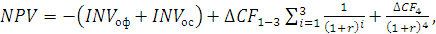 де INVоф , INVос – інвестиції в основні засоби й оборотні фонди, тис. грн.; ДCF1-3 – приріст грошового потоку (аннуитета) за три роки, тис. грн.; ДCF4 – приріст грошового потоку в четвертому році реалізації проекту, тис. грн.; r – ставка дисконту – 0,20.