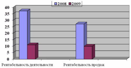 Рис. 2.1. Основные показатели деятельности ГК «Космос» за 2008 – 2009 г., тыс. руб. Переходя к показателям, характеризующим эффективность деятельности гостиницы «Космос», можно отметить негативную динамику этих показателей. В 2008 г. значение показателей рентабельности составили 37,21% и 27,12% соответственно по рентабельности деятельности и рентабельности продаж. В отчетном периоде произошло понижение этих показателей до 11,04 % и 9,94% соответственно по рентабельности деятельности и рентабельности продаж, (Рис.2.2).