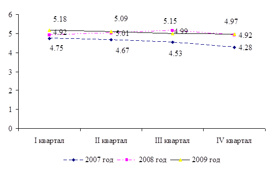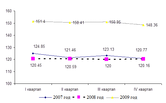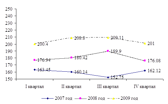 Данный график наглядно отражает нестабильность соотношения данных валют за период 2007 – 2009 годов. В 2007 году курс тенге к доллару был относительно стабилен, максимальное значение было зафиксировано на уровне 124,85, минимальное – 120,77. В 2008 году резких колебаний курса не наблюдалось, максимальное значение зарегистрировано на уровне 120,59 и минимальное 120 тенге за доллар. Резкий скачок курса произошёл в феврале 2009 года. Курс доллара поднялся с 121,56 тенге до уровня 150,26 тенге. Среднее значение курса за первый квартал 2009 года составило 151,4 тенге за 1доллар. После проведения Национальным банком мероприятий по стабилизации ситуации и курса национальной валюты, данное соотношение стало снижаться [11]. Во втором квартале средний курс составил 150,41 тенге за доллар, в третьем квартале – 150,95,в четвёртом квартале – 148,36.