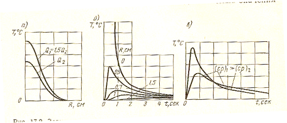 Рис. 6.2. Зависимость процесса распространения теплоты от мгновенноготочечного источника в полубесконечном теле: а — от количества введенной теплоты Q; б — от расстояния Rдо точки О; в — от теплоемкости материала cγ При постоянной теплоемкости cγувеличение коэффициента теплопроводности металла λ приводит к ускорению процесса распространения теплоты. Максимальные достигаемые значения температур в различных точках остаются теми же самыми, но продолжительность времени с момента введения теплоты до получения максимальной температуры сокращается во столько раз, во сколько раз повышается теплопроводность материала λ. Указанная закономерность обнаруживается, если преобразовать уравнение (6.1), приняв a = λ/cγ: