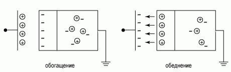 Рисунок 1.1.1 – Изменение концентрации свободных носителей в приповерхностной области полупроводника при наличии вблизи поверхности заряженной металлической плоскости Случай, когда в приповерхностной области возрастает концентрация свободных носителей, носит название обогащение, а когда в приповерхностной области уменьшается концентрация свободных носителей - обеднение. Если концентрация доноров в объеме полупроводника ND