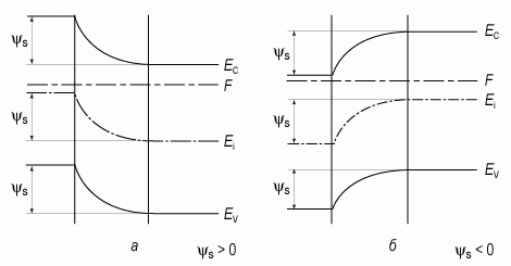 Значение электростатического потенциала на поверхности полупроводника называется поверхностным потенциалом и обозначается символом ψs . Знак поверхностного потенциала ψs соответствует знаку заряда на металлическом электроде, вызывающего изгиб энергетических зон. ψs > 0, зоны изогнуты вниз, ψs < 0, зоны изогнуты вверх (рис. 11).