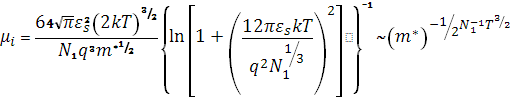 где N1 — концентрация ионизированных примесей, εs — диэлектрическая проницаемость. Видно, что в этом случае подвижность также уменьшается с ростом эффективной массы m*, но cростом температуры она увеличивается. Результирующая подвижность