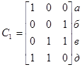 1. Столбец 6 содержит минимальное число единиц – 1. 2. Строка г заносится в покрытие и удаляется из матрицы. 3. Удаляются столбцы 3, 5, 6. Получаем матрицу 1 2 4