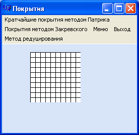 Единственное покрытие последней матрицы – она сама. Итого, строки г и и составляют одно из кратчайших (даже единственное) покрытий матрицы A. 5. ПРОГРАММА Написанная мной на ЭВМ программа «Нахождение кратчайшего покрытия булевых матриц» помогает вручную не искать покрытие заданной или генерируемой булевой матрицы до размера 99 х 99, а предоставить это компьютеру. 5.1 Описание программы Средство программирования: Интегрированная Среда Разработки BorlandC++ Builder 6.0. Поддерживаемые операционные системы: Windows 95/98/ME/NT/2000/XP. Система для тестирования программы: Pentium-4 ~2.3 Gh, 512 MbDDR, WindowsXPSP2. 5.2 Описание интерфейса Pokrytie.exe – откомпилированная и отлаженная программа. При запуске отображается окно дополнительной информации: