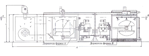 Мал. 2. Горизонтальна проекція ротаційної технологічної установки,представлений ний на Рис.1 Для нагріву форм в сучасних технологічних установках в основному використовується масло. Нагріваючі і охолоджуючі канали, виконані таким чином, що здатні забезпечити підтримку рівномірної температури. Для виготовлення одногніздних форм з подвійною стінкою в основному використовується листова сталь. Стійки створюють опору для зовнішньої поверхні і внутрішніх стінок. По своїх розмірах і типі кріплення ці стійки такі, що вони без необхідності не збільшують теплоємність форми, одночасно забезпечуючи оптимальне протікання теплоносія (мал. 13.3). При конструктивному виконанні ротаційних форм, як і при конструюванніі інших пресформ, призначених для переробки полімерної сировини, необхідно уникати гострих кромок і кутів, а також значних відмінностей в товщині стінок