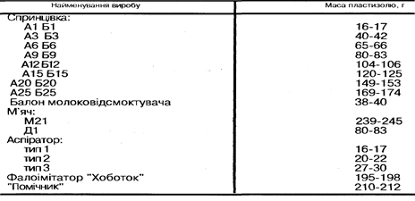 Активність спринцівок визначається часом, на протязі якого спринцівка заповнюється певною кількістю води, попередньо витисненої з неї. Спринцівки виготовляють будь – якого кольору. Нерівномірність кольору відхилення від норми не рахується. На поверхні спринцівок не допускаються тріщини, розриви та відхилення по розмірам і кількості, які перевищують величини дані в таблиці 2. Таблиця 1.2