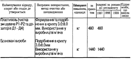 Заповнені пластизолем форми герметично закривають і подають в камеру формування, де при температурі (230 – 240)о С проходить спікання пластизолю. З допомогою реле часу лінії “Сфера – 2” задають час формування: для спринцівок і аспіраторів – 6 хв., для м’ячів та фалоімітаторів 10 хв. Швидкості обертання валів складають: горизонтальна – 6.3 об./хв., вертикальна – 2.7 об/хв.. Після камери формування форми автоматично подаються в камеру охолодження для розпилення водою та обдувом повітря. Режим охолодження підбирають в залежності від типу форм і їх кількості. Видалення виробів, підготовка ротаційних режимів Видалення виробів з форм проводиться вручну. Одночасно проводять видалення облою. Внутрішню поверхню форм обдувають стисненим сухим повітрям для видалення вологи і облою. Сверління виробів Сверління виробів в спринцівках типу А проводять на пристрої для сверління С1 із застосуванням свердл у відповідності до номеру спринцівки. Діаметр отвору повинен становити: А1 – 2.5±0.5 мм; А9 – 3.5±0.5 мм. Роздування м’ячів М’ячі роздувають до заданого розміру з допомогою стисненого повітря після видалення їх з ротаційних форм. Отвр закривають технологічною заглушкою і по транспортеру м’ячі направляють в накопичувач, де витримуються на протязі не менше 6 годин. Комплектування фаплоімітаторів Фалоімітатор після видалення з ротаційних форм витримують при кімнатній температурі не менше 24 годин, а потім роздувають до заданого розміру за допомогою стиснутого повітря. Отвір закривають ніпелем і пакують в споживчу тару або картонні ящики. Подрібнення відходів Пластизоль після чистки змішувача Р1, Р2 та дозаторі Д1 – Д4 заливають вручну в ротаційні форми і проводять формування, згідно режимів. Браовані вироби сортують по кольору і подрібнюють на дробарці Д1 до крихти розміром 3.0 : 8.0 мм. Отримані крихти використовують для виробництва м’ячів типу “конфеті” , або затарюють в мішки і здають на склад. Контроль, сортування та пакування готової продукції Готові вироби розпаковують у відповідності з вимогами до готової продукції, сортують і упаковують в гофрокартонні ящики. Аспіратори та фалоімітатори можуть упаковуватись на вакуумпакувальному пристрої типу “Skin” “Blister”. М’ячі попередньо здувають і пакують в стретч – плівку або поліетиленовий рукав. Упаковані готові вироби здають на склад. 15. Щорічні норми утворення відходів виробництва Таблиця 5.3
