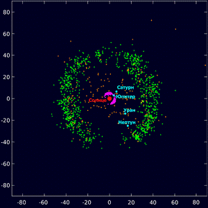 Комета Хейла — Боппа Кометы — малые тела Солнечной системы, обычно размером всего в несколько километров, состоящие главным образом из летучих веществ (льдов). Их орбиты имеют большой эксцентриситет, как правило, с перигелием в пределах орбит внутренних планет и афелием далеко за Плутоном. Когда комета входит во внутреннюю область Солнечной системы и приближается к Солнцу, её ледяная поверхность начинает испаряться и ионизироваться, создавая кому: длинное облако из газа и пыли, часто видимое с Земли невооружённым глазом. Короткопериодические кометы имеют период меньше 200 лет. Период же долгопериодических комет может равняться тысячам лет. Полагают, что источником короткопериодических служит пояс Койпера, в то время как источником долгопериодических комет, таких как комета Хейла — Боппа, считается облако Оорта. Многие семейства комет, такие как Околосолнечные кометы Крейца, образовались в результате распада одного тела[70] . Некоторые кометы с гиперболическими орбитами могут быть из-за пределов Солнечной системы, но определение их точных орбит затруднено[71] . Старые кометы, у которых большая часть их летучих веществ уже испарилась, часто классифицируют как астероиды[72] . Кентавры Кентавры — ледяные кометоподобные объекты с большой полуосью, большей, чем у Юпитера (5,5 а. е.) и меньшей чем у Нептуна (30 а. е.). У крупнейшего из известных кентавров, Харикло, диаметр приблизительно равен 250 км[73] . Первый обнаруженный кентавр, Хирон, также классифицирован как комета (95P), из-за того что по мере приближения к Солнцу у него возникает кома, как и у комет[74] . Транснептуновые объекты Пространство за Нептуном, или «регион транснептуновых объектов», всё ещё в значительной степени не исследовано. Предположительно, оно содержит только малые тела, состоящие главным образом из камней и льда. Этот регион иногда также включают во «внешнюю Солнечную систему», хотя чаще этот термин используют, чтобы обозначать пространство за поясом астероидов и до орбиты Нептуна. Пояс Койпера