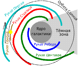 Структура Млечного Пути. Расположение Солнечной системы обозначено большой жёлтой точкой Солнечная система является частью Млечного Пути — спиральной галактики, имеющей диаметр около 30 тысяч парсек (или 100 тысяч световых лет) и состоящей из приблизительно 200 млрд звёзд[136] . Солнечная система расположена вблизи плоскости симметрии галактического диска (на 20—25 парсек выше, то есть севернее него), на расстоянии около 8 тысяч парсек (27 тысяч световых лет)[137] от галактического центра (практически на равном расстоянии от центра Галактики и её края), на окраине рукава Ориона[138] — одного из галактических рукавов Млечного Пути. Солнце вращается вокруг галактического центра по почти круговой орбите со скоростью около 254 км/с[источник не указан 44 дня ] (уточнено в 2009 г.) и совершает полный оборот за 200 млн лет[источник не указан 44 дня ] . Этот промежуток времени называется галактическим годом [139] . Солнечный апекс (направление пути Солнца через межзвёздное пространство), расположен в созвездии Геркулеса в направлении текущего положения яркой звезды Вега[140] . Помимо кругового движения по орбите, Солнечная система совершает вертикальные колебания относительно галактической плоскости, пересекая её каждые 30—35 млн лет и оказываясь то в северном, то в южном галактическом полушарии[141] [142] [143] . Местоположение Солнечной системы в галактике, вероятно, является фактором эволюции жизни на Земле. Её орбита практически круглая; и скорость примерно равна скорости спиральных рукавов, что означает, что она проходит сквозь них чрезвычайно редко. Это даёт Земле длительные периоды межзвёздной стабильности для развития жизни, так как спиральные рукава обладают значительной концентрацией потенциально опасных сверхновых[144] . Солнечная система также находится на значительном расстоянии от переполненных звёздами окрестностей галактического центра. Около центра, гравитационные воздействия соседних звёзд могли возмутить объекты облака Оорта и направить множество комет во внутреннюю Солнечную систему, вызвав столкновения с катастрофическими последствиями для жизни на Земле. Интенсивное излучение галактического центра также могло повлиять на развитие высокоорганизованной жизни[144] . Некоторые учёные выдвигают гипотезу, что возможно даже в текущем положении Солнечной системы, недавние сверхновые неблагоприятно воздействовали на жизнь в прошедшие 35 000 лет, выбрасывая части звёздных ядер к Солнцу в виде частиц радиоактивной пыли и больших кометоподобных объектов[145] . Окрестности