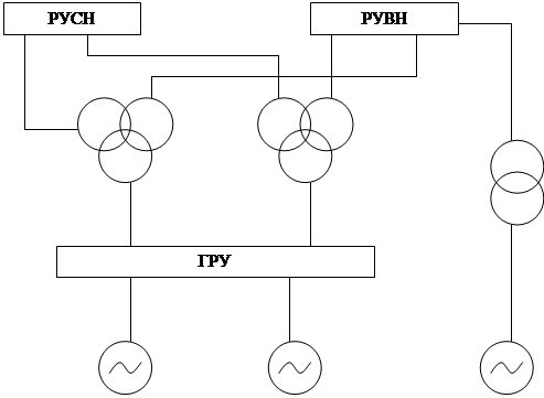 Обрана схема РУ задовольняє наступним вимогам: 1. Ушкодження або відмова кожного з вимикачів не приводить до відключення більше одного енергоблоку. 2. Збіг відмови або ушкодження одного з вимикачів з ремонтом будь-якого іншого не приводить до відключення більше двох блоків і ліній, якщо при цьому зберігається усталена робота енергосистеми або її частини. 3. Кожний генератор приєднується до шин підвищеної напруги через окремі трансформатори й вимикачі. 4. Відключення приєднань виробляється: ЛЕП - не більш, ніж двома вимикачами; енергоблоків, трансформаторів зв'язку, трансформаторів власних потреб - не більш, ніж трьома вимикачами РУ кожної напруги. У ГРУ 6кВ застосовуємо схему із двома системами збірних шин. Достоїнством цієї схеми є можливість ремонту будь-якої системи шин без відключення споживачів і джерел. Живлення споживачів генераторної напруги здійснюється через реактори. Збірні шини ГРУ ділімо по числу генераторів. Для обмеження струмів трифазного к.з. у схемі передбачаємо секційні реактори. На середній напрузі застосовуємо схему містка з перемичкою убік ліній. На вищій напрузі застосовуємо схему з однієї робочою й обхідною системами шин з обхідними й секційними вимикачами. Що дає можливість робити ревізію й випробування вимикачів без перерви роботи. 6. Складання схеми заміщення у відносних одиницях Опір елементів електричних кіл може бути задане в іменованих величинах і у відсотках або відносних величинах. Для того, щоб схему заміщення можна було перетворити до найпростішого виду, необхідно привести параметри елементів схеми до одного якого-небудь щабля напруги або виразити ці параметри в єдиних масштабах. Останнє в установках напругою вище 1000 У зручніше за все робити за допомогою системи відносних одиниць (о.с.). Щоб одержати відносне значення якої-небудь величини, потрібно поділити її на величину, прийняту за одиницю виміру. При цьому за одиницю виміру або, як прийнято називати, за базисну величину може бути прийняте будь-яке кількісне значення параметра відповідної розмірності. Сутність системи о.е. полягає в тім, що всі величини, що фігурують у розрахунках, - опору X , струми I , напруги U і потужність S - виражаються не у звичайних одиницях (Ом, А, кВ, МВА), а в частках від прийнятих Базисні величини зв'язані між собою законом Ома: