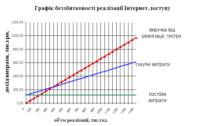 Визначення точки беззбитковості Рівень беззбитковості по кожному виду продукції визначався, виходячи з найменшого рівня цін без податку на додаткову вартість за формулою: Q=F/(P-V), де Q – точка беззбитковості, P – ціна реалізації, F – величина постійних витрат, V – величина змінних витрат на одиницю продукції. У зв'язку з тим, що при наявності декількох видів продукції, що випускається, на підприємстві розділити витрати на постійні і перемінні дуже складно, то за постійні витрати був прийнятий найбільший планований рівень накладних витрат, розподілений по видах продукції відповідно до частки основної заробітної плати в загальному фонді заробітної плати в 1 році. Саме такий підхід дозволяє визначити скільки продукції кожного виду необхідно продати для досягнення беззбитковості фірми. Також був використаний традиційний підхід при визначенні точки беззбитковості в умовах продажу декількох видів послуг – визначення точки беззбитковості на одну гривню послуг. Для послуг по Інтернет-доступу беззбитковим рівнем роботи є обсяг у 651,3 тис. год. у рік, що складає приблизно 1784 годин доступу в день. Цей рівень досягається при середньому варіанті на третій квартал, при мінімальному рівні попиту – на другий рік. Причому, скорочення накладних витрат (скорочення витрат на маркетинг і на утримання адміністративно-управлінського персоналу) не дає ефекту, тому що велику частину накладних витрат (60%) займають лізингові виплати за серверне устаткування. Однак, варто взяти до уваги, що при розрахунку використовувалася мінімальна ціна за одну годину – 0,60 грн., у той час як у перший рік роботи планується встановлення ціни в середньому на рівні 0,77 грн. за годину роботи в мережі. При даній ціні беззбитковість підприємства досягається при обсязі виробництва 309,8 тис. годин у рік (848 годин у день). У цьому випадку підприємство досягає точки беззбитковості по середньому варіанті вже в першому кварталі, а по мінімальному – у третьому.