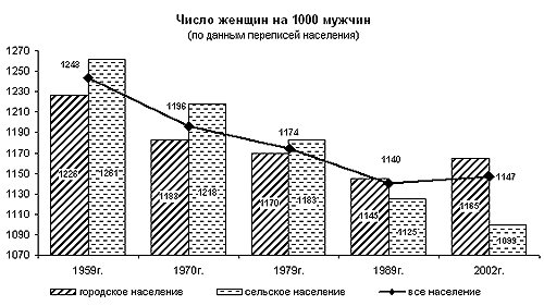 На 1000 мужчин в 2002г. приходилось 1147 женщин, в 1989г. - 1140 женщин.