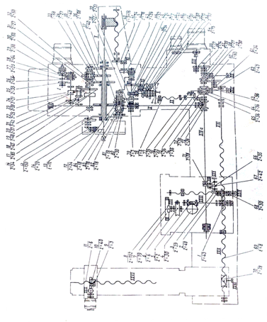 Для групових ліній приймаємо кабель ВВГ 4×2,5мм2 з умов механічної міцності. В якості групових щитів приймаємо освітлювальні щити типу ЩО31-21 з втоматичними вимикачами на вводі типу ВА47-29М, Ін =25А і на групових лініях 55Q11, Ін =6А по 6 штук. В якості ссилового пункту вибираєм СПУ-62. В СП застосовуємо запобіжники ПНП 60 з номінальним струмом плавкої вставки 20А. 2.4 Технічна характеристика виробничого механізму Універсальні горизонтально-розточні станки 2А614 служать для обробки корпусних деталей з точними отворами, зв'язаними між собою точними відстанями. Найбільша вага оброблюваної деталі 1000 кг. Верстат 2А614 має радіальний супорт на вбудованій планшайбі і нормальний висувний розточний шпиндель. Цей верстат відрізняється великою універсальністю і призначений переважно для робіт, що вимагають застосування радіального супорта при обточуванні торцевих поверхонь і консольному розточуванні отворів великих діаметрів, а також для роботи висувним шпинделем. На станку можна проводити свердління, розточування, зенкерування і розгортання отворів, фрезерування площин і пазів висувним шпинделем, а також обточування горців, розточування отворів і кільцевих канавок радіальним супортом планшайби. Тип станка – універсальний горизонтально-розточний Габарити: 2300×2325×3190 Маса: 2300кг Діаметр розточного шпинделя: 80мм Найбільший крутящий момент на шпинделі: 40Н·м Повна потужність 10кВт Коефіцієнт потужності 0,5 Кінематична схема верстату дозволяє здійснювати: обертання шпинделя і планшайби; подачу шпинделя, розточувальної бабки, радіального супорта, люнету, а також повздовжнє , поперечне і кругове переміщення стола. Обертання шпинделя і планшайби здійснюється від двошвидкісного електродвигуна через коробку швидкостей, що забезпечує отримання 20 значень оборотів шпинделя і 15 значень оборотів планшайби. Привід подачі здійснюється від електродвигуна постійного струму, що працює в широкому діапазоні регулювання. Постійність вибраної подачі забезпечується наявністю електричного зворотнього зв’язку. Переміщення люнету задньої стійки здійснюється незалежно від переміщення розточувальної бабки від окремого електродвигуна. Коробка швидкостей розміщена в корпусі розточувальної бабки. Всі вали коробки швидкостей обертаються на підшипниках кочення. Шестерні коробки швидкостей піддані термічній обробці, що у поєднанні з шліфованим профілем зубів забезпечує ним тривалу роботоспособність при збереженні первинної точності. Розточний шпиндель виконаний із сталі 35ХЮА і підданий азотуванню, що у поєднанні з втулками гільзи, виконаними з шарикопідшипникової сталі, забезпечує тривале збереження точності. Гільза шпинделя обертається на трьох підшипниках кочення високої точності. Передній підшипник допускає регулювання радіального зазору. Планшайба нерухомо закріплена на гільзі, що обертається на точних роликових підшипниках, розташованих в корпусі бабки. Включення і відключення обертання планшайби проводиться спеціальною муфтою. Кінематична схема горизонтально-розточного верстату 2А614 приведена на рисунку 2.3
