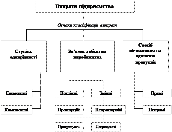Рис. 1. Класифікація витрат підприємства 1.3 Калькуляція собівартостіКалькуляція собівартості являє собою визначення витрат за статтями собівартості. Об'єктом калькулювання є продукція чи послуги, собівартість яких обчислюється. Калькуляційною є одиниця кількісного вимірювання продукції (штуки, тонни, метри тощо). Розглянемо більш докладно, як складають калькуляцію собівартості. Стаття І. Сировина і матеріали. До цієї статті належать такі витрати: · на сировину; · на основні і допоміжні матеріали; · на покупні вироби та напівфабрикати. Стаття II. Енергія технологічна. Ця стаття включає в себе витрати на всі види енергії для роботи виробництва: · паливо; · електроенергію; · пар; · газ. Така енергія безпосередньо використовується в технологічному процесі для зміни стану або форми предметів праці (плавлення, сушіння, зварювання, пошиття тощо). Стаття III. Основна та додаткова заробітна плата основних виробничих робітників. До цієї статті належать витрати на оплату праці робітників, які безпосередньо виготовляють продукцію. · доплати та надбавки робітникам за кваліфікацію; · доплати та надбавки робітникам за перевиконання плану; · доплати та надбавки робітникам за роботу в святкові та вихідні дні; · доплати та надбавки робітникам за виконання державних обов'язків; · оплату відпусток та ін. Стаття IV. Утримання та експлуатація машин і механізмів. Вона включає в себе такі витрати: · амортизаційні відрахування на машини та устаткування; · витрати на електроенергію, пальне, мастильні матеріали для машин та устаткування; · витрати на придбання технологічного інструменту, запасних частин та агрегатів для устаткування; · витрати на ремонт та технологічне обслуговування; · витрати на заробітну плату обслуговуючого персоналу Стаття V. Загальновиробничі (накладні) витрати. Стаття V, як і ст. IV, також є комплексною. Вона поєднує витрати на такі потреби: · управління, виробниче і господарське обслуговування в межах виробництва; · заробітну плату з відрахуваннями на соціальні потреби працівників управління, спеціалістів, службовців; · амортизаційні відрахування по будівлях і спорудах; · охорону праці; · техніку безпеки, охорону, протипожежну безпеку; · досліди, випробування, винахідництво; · підготовку кадрів, адміністративні та канцелярські витрати; · відрядження; · обов'язкові платежі (страхування майна, платежі за забруднення навколишнього середовища); · придбання патентів, ліцензій тощо. Розподіляються накладні витрати пропорційно до основної заробітної плати основних виробничих робітників, крім амортизаційних відрахувань. Вони обчислюються окремо і додаються до визначеної суми: Стаття VI. Підготовка і освоєння виробництва. До даної статті належать витрати на такі цілі: · освоєння нових підприємств, виробництв, цехів; · підготовку і освоєння нової продукції; Стаття VII. Позавиробничі витрати. До позавиробничих відносять витрати на такі цілі: · маркетингові дослідження; · рекламу продукції; · заходи щодо стимулювання збуту. Деякі з цих витрат є прямими і їх можна обчислити безпосередньо на окремі вироби (витрати на тару, пакування, транспортування, рекламу), а деякі – непрямими (на аналіз та дослідження ринку; комісійні виплати організаціям збуту; проведення ярмарків). Такі витрати розподіляються між виробами пропорційно до виробничо
