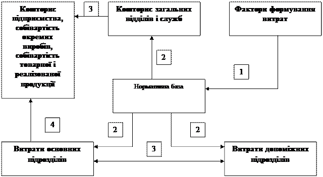 1.4 Основні методи калькулювання собівартостіПозаказний метод застосовується найчастіше в індивідуальному і дрібносерійному виробництві, а також для калькулювання собівартості робіт ремонтного й експериментального характеру. Метод цей полягає в тому, що витрати на виробництво враховуються по замовленням на виріб чи на групу виробів. Фактична собівартість замовлення визначається по закінченні виготовлення виробів чи робіт, що відносяться до цього замовлення, шляхом підсумовування усіх витрат по даному замовленню. Для начислення собівартості одиниці продукції загальна сума витрат за замовленням поділяється на кількість випущених виробів. Попередільний метод калькулювання собівартості знаходить застосування в масовому виробництві з коротким, але закінченим технологічним циклом. Продукція, що випускається підприємством, однорідна по вихідному матеріалу і характеру обробки. Облік витрат при цьому методі здійснюється по стадіях (фазам) виробничого процесу. Нормативний метод обліку і калькулювання є найбільш прогресивним, тому що дозволяє вести повсякденний контроль за ходом виробничого процесу, за виконанням завдань по зниженню собівартості продукції. В цьому випадку витрати на виробництво підрозділяються на дві частини: витрати в межах норм і відхилення від норм витрат. Все витрати в межах норм враховуються без групування, по окремим замовленням. Відхилення від встановлених норм враховуються по їх причинам и винуватцям, що дає можливість оперативно аналізувати причини відхилень. При цьому фактична собівартість виробу при нормативному методі обліку визначається шляхом сумування витрат по нормам і витрат в результаті відхилень і змін поточних нормативів. При використанні кожного з перерахованих методів контроль за рівнем витрат найбільш ефективно здійснювати по місцям їх виникнення, центрам витрат, центрам відповідальності. Центри витрат представляються виробничими і структурними підрозділами, які характеризуються різноманіттям функцій і виробничих операцій, що дозволяє деталізувати облік, посилити контроль за витратами і підвисить точність калькулювання. Центр відповідальності – організаційний підрозділ, який очолюється керівником, котрий забезпечує контроль планових, нормативних і фактичних витрат. Вони підрозділяються на головні і функціональні. Головні центри контролюють витрати по місцям їх виникнення, а функціональні поширюють витрати на інші місця їх виникнення при умові, що цей центр обслуговує кілька центрів витрат. 1.5 Планування витрат План витрат у складі показників кошторису (собівартості продукції) і планових калькуляцій виробів розробляється на основі Виробничої програми підрозділу і норм витрат ресурсів. Для кращого сприйняття схема істотно спрощена, на ній не показано взаємозв'язків між підрозділами в процесі розроблення плану й особливо між основними і допоміжними структурними одиницями. Одним із проявів таких зв'язків є метод формування внутрішніх витрат, а саме напівфабрикатний і безнапівфабрикатний. У першому випадку до складу витрат підрозділів входить вартість напівфабрикатів і продукції, виготовленої іншими підрозділами підприємства. Такий порядок обов'язковий, коли між підрозділами існують справжні чи умовні ринкові відносини. За безнапівфабрикатного мет