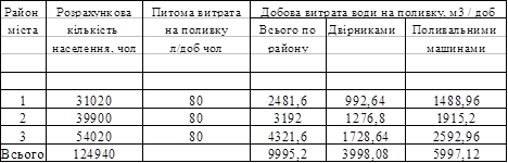 Добова витрата на поливку вулиць і зелених насаджень визначається по [1], по витраті води з розрахунку на 1-ого мешканця, який приймаємо л/доб.люд. Із загальної витрати води на поливку 40% використовують двірники, 60% - поливальні машини. Розрахунок водоспоживання на поливку вулиць і зелених насаджень зводиться в табл. 2.3 Таблиця 2.3 – Добові витрати води на поливку вулиць та зелених насаджень