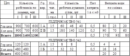 Витрата води на промислових підприємствах складається з витрат на господарсько-питні потреби робітників, прийняття душу й виробничі потреби підприємства. Витрата води на господарсько-питні потреби робітників, зайнятих на підприємстві, визначають для кожної зміни, виходячи з кількості працюючої й питомої витрати на один працівника. На першому підприємстві в гарячих цехах працює 50%робітників, а 50% у холодних.На другому підприємстві в гарячих цехах працює 20%,а холодних-80% робітників. Розрахунки по визначенню витрат на господарсько-питні потреби робітників, зайнятих на підприємстві, представлені в таблиці 2.4. Таблиця 2.4 – Добові витрати на господарсько-питні потреби робітників