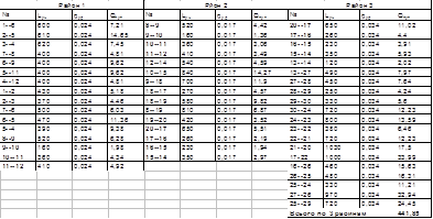 де Ув’язка проводимо за допомогою програми GIDRAST. Результати ув’язки заносяться до табл.3.5, табл. 3.6. та табл. 3.7 Дійснийпотокорозподіл приводиться на схемі мережі на рис. 3.4 для режиму максимального водорозбору і на рис. 3.5 для режиму пожежі в годину максимального водорозбору, на рис. 3.6 для режиму транзиту. 2.4.5 Визначення п’єзометричних позначок і вільних напорів у вузлах мережі Визначення розрахункових позначок починаємо з визначення місця знаходження невигідної точки мережі, тобто точки, яка в місці підключення водоводів до мережі вимагає найбільшої п’єзометричної позначки. Потрібні п’єзометричні позначки в вузлах мережі: Пі = Нс тр і + zі ,(2.14) де Нс тр і - потрібний вільний напір в вузлі, м; zі - абсолютна позначка і-го вузлу, м. Нс тр і = 6+4n, (2.15) де n – кількість поверхів в спорудах розглядає мого району. Для режиму максимального водоразбора невигідна точка є вузол 28. Для режиму пожежі в годину максимального водоразбора невигідна точка є вузол 28. Для випадку максимального транзиту невигідною точкою є водонапірна башта. Розрахунок приводиться на розрахунковій схемі. на рис. 3.7 та рис. 3.8, 3.9. 2. 5 Визначення питомих, шляхових, вузлових витрат для другого варіанту Питомі й шляхові витрати визначаємо для випадку максимального водоспоживання табл. 4.1,4.2 та випадку транзит табл. 4.3, 4.4. Вузлові - для кожного з намічених режимів роботи водогінної мережі. Максимальний годинний відбір води припадає на годину 16-17, коли з мережі забирається 3875,11м3 . Максимальний транзит води припадає на годину 20-21, коли з мережі забирається 2100,69м3 . Питома витрата й - того району при максимальному водоспоживанні згідно (2.9) Шляхові витрати ділянок згідно (2.10) Вузлові витрати для випадку максимального водоспоживання за (2.11) 2.5.1 Початковий потокорозподіл і вихідні розрахункові схеми мережі Витрату води у вузлі сходу розподіляється по ділянках водопровідної мережі, які сходяться у вузлі, додержуючись умови за (2.12) За розрахункові витрати, згідно з якими визначаємо діаметр окремих ділянок, в системі з водонапірною баштою в початковій точці приймаємо розрахункові витрати цих ділянок для випадку максимального водорозбору. Попередній потокорозподіл виконується на схемі мережі на рис. 4.1 для режиму максимального водорозбору, на рис. 4.2 для режиму пожежі в годину максимального водо розбору і на рис. 4.3 для режиму транзиту. 2.5.2 Гідравлічна ув’язка водопровідної мережі на ЕОМ Гідравлічну ув’язку водопровідної мережі виконуємо для визначення реального потокорозділу по лініях мережі при вже вибраних діаметрах труб. За (2.13)Ув’язка проводимо за допомогою програми GIDRAST. Результати ув’язки заносяться до табл.4.5, табл. 4.6. та табл. 4.7 Дійснийпотокорозподіл приводиться на схемі мережі на рис. 4.4 для режиму максимального водорозбору і на рис. 4.5 для режиму пожежі в годину максимального водорозбору, на рис. 4.6 для режиму транзиту. Таблиця 3.1 Визначення шляхових витрат