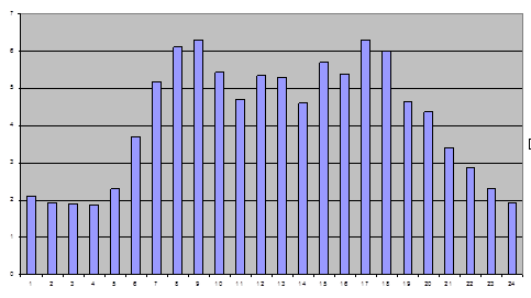 Витрати води на виробничі потреби на першому підприємстві QI = 8000 м3 /доб на другому підприємстві QII =4000 м3 /доб. Розрахункова витрата на пожежогасіння і кількість одночасних пожеж для житлової забудови прийнято за [1, табл.5]: 35 л/с на одну зовнішню пожежу і 5 л/с на одну внутрішню пожежу при 2-х одночасних пожежах в місті. Розрахункова витрата на пожежогасіння промислових підприємств прийнята15 л/с, що відповідає I, II ступені вогнестійкості споруди промислового підприємства при пожежній небезпечності виробництва на ньому відповідаючих категорії А,Б. Розрахункова витрата води на пожежогасіння в місті : Qпож. =2*(40+5)+0,5*15=97,5 л/с. (2.5) При розрахунковій тривалості гасіння пожежі, яка дорівнює 3 години, об’єм води на потреби пожежогасіння: Wп = 3*3600* Qпож. /1000, (2.6) Wп = 3*3600* 97,5. /1000=1053 м3 . 2.2 Режим водоспоживання міста Для визначення режиму водоспоживання води на господарсько-питні потреби кожного району міста визначаємо максимальний коефіцієнт годинної нерівномірності: