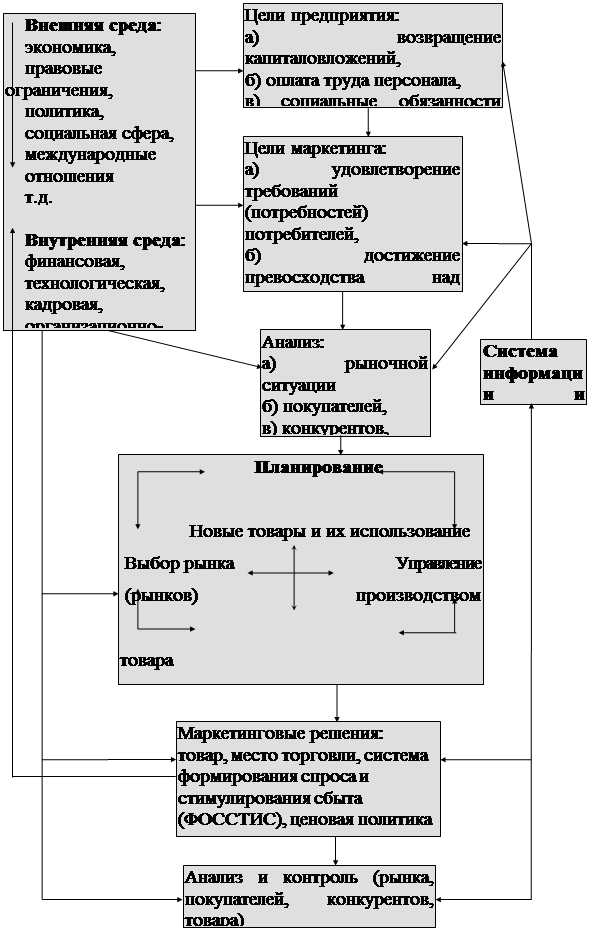 З багатьох причин один суб'єкт звичайно не бере на себе виконання всіх маркетингових функцій: · багато виробників не мають у своєму розпорядженні достатні фінансові ресурси для прямого маркетингу; · прямий маркетинг часто вимагає від виробників випуску відповідної продукції або продажі відповідних товарів інших фірм; · організація не може, або не хоче виконувати певні функції й шукає для цього фахівців з маркетингу (так багато компаній прибігають до послуг спеціалізованих рекламних агентів; використовують дослідні організації для розробки поросних листів, збору й аналізу даних.); · багато організації малі для ефективного виконання певних функцій; · для багатьох товарів і послуг уже існують відпрацьовані методи реалізації, і обійти їх важко; · багато споживачів з метою економії коштів можуть робити покупки у більших кількостях, самостійно забирати товар, користуватися самообслуговуванням і т.д. Кожне підприємство має певні ресурси - фінансовими, виробничими, кадровими й т.д. Ці ресурси воно повинне мобілізувати і направити на те, щоб використати існуючий ринковий потенціал найбільш рентабельним образом, що забезпечує акумуляцію коштів, що робить можливим існування підприємства і його розвитку. При цьому воно повинне вести відбір і орієнтуватися на такі ринки, які мають гарний потенціал для реалізації необхідного обсягу продажів і одержання необхідного прибутку. Підприємствам, що застосовують концепцію маркетингу, варто виходити з наступного: 1.Міри, які підприємство приймає заради найкращого використання існуючого ринкового потенціалу, повинні бути двоякого характеру. З одного боку, підприємство повинне запропонувати споживачам продукти, що задовольняють їхнім потребам і бажанням і за ціною, що вони хочуть і можуть за ці продукти заплатити. З іншого боку, воно повинне вживати продумані акції впливу на споживача, щоб вони купували їхні продукти. З розвитком концепції маркетингу стало видно, що політика продажу й робота служб продажі можуть бути успішними, а споживачі можуть бути "піймані на гачок" тоді, коли продукти задовольняють їхнім потребам, а ціни для них прийнятні, а це вже завдання абсолютно всіх служб підприємства. 2.Фінансовий ефект повинен бути основним критерієм прийняття господарських рішень. Обсяг продажів, забезпечений правильною орієнтацією на задоволення потреб споживача, і всі інші заходи для найбільшого використання ринкового потенціалу - не самоціль. Не важливий і обсяг виробництва, як такий. Важливий фінансовий ефект. Кінцева мета маркетингу складається в здійсненні задовільного фінансового ефекту, що робить можливим акумуляцію коштів, що дає можливість підприємству жити й розвиватися. Звідси збільшення обсягу виробництва й обсягу продажів має сенс остільки, оскільки проглядається задовільний фінансовий результат господарювання. 1.2 Методи організації маркетингу Методи маркетингової діяльності визначається у тому, що проводиться: · Аналіз зовнішньої (стосовно підприємства) середовища, у яку входять ринки, джерела постачання й багато чого іншого. Аналіз дозволяє виявити фактори, що сприяють комерційному успіху або створюють перешкоді цьому. У результаті аналізу формується банк даних для прийняття обґрунтованих маркетингових рішень. · Аналіз споживачів, як актуальних (діючих, що ку