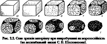 Стійкість матеріалу, насиченого водою, до поперемінного заморожування і відтаювання називається морозостійкістю. Морозостійкість обумовлена опором матеріалів високому тиску, що виникає в їхніх порах при заморожуванні води. Кристалізація льоду супроводжується збільшенням об'єму приблизно на 8 % і розвитком тиску до 200 МПа. При чергуванні циклів заморожування і відтаювання в матеріалах накопичуються залишкові деформації, що приводять до руйнування (рис.2.2). Розходження коефіцієнтів термічного розширення компонентів, що входять у матеріали, також приводить до напруженого стану. Показником морозостійкості є число циклів (для деяких матеріалів – від'ємна температура), що витримують зразки при припустимому ступені руйнування. Для більшості будівельних матеріалів після іспиту їх на морозостійкість зниження міцності допускається не більш 25 %, а втрати маси – 5 %. Морозостійкість залежить від складу, пористості і структури порового простору; вона знижується зі зменшенням водостійкості і ростом водопоглинення матеріалів. Для зниження тиску льоду ефективне утворення в матеріалі замкнутих повітряних пор, що виконують роль амортизаторів. Випробування матеріалів на морозостійкість ведуть у морозильних камерах звичайно при –15...–18 °С, коли в більшості капілярів вода переходить у лід. Подальше зниження температури веде до істотного зменшення морозостійкості, що пояснюється залученням у процес руйнування усе більш тонких капілярів. При роботі пористого матеріалу в умовах визначеного тиску води спостерігається її фільтрація. В залежності від структури порового простору можливі в’язкісний, капілярний чи дифузійний переноси води. При в’язкісному переносі вода переміщається тільки у вигляді рідини, при капілярному вона може переноситися й у вигляді пари, а при дифузійному – у вигляді окремих молекул. Здатність матеріалів не пропускати воду під тиском називають водонепроникністю. Практично водонепроникними вважаються матеріали, відносна щільність яких наближається до одиниці (метали, скло, полімери). Високу водонепроникність мають матеріали із замкненими порами, а також ті, що вміщують в основному мікрокапіляри (кераміка, тонкодисперсні глини й ін.). Порівняно низька водонепроникність характерна для матеріалів зі сполученими капілярами. Водонепроникність матеріалів виміряється трьома методами: тиском води, що витримує зразок протягом заданого часу без появи ознак фільтрації; часом, необхідним для проходження заданого об'єму води при постійному тиску; кількістю води, яка просочилася протягом заданого часу при встановленому тиску. Найбільш розповсюджений перший метод. Він застосовується для оцінки водонепроникності бетону, рулонних гідроізоляційних матеріалів, асфальтових мастик і т.д. Теплофізичні властивості. У цю групу входять властивості матеріалів, що характеризують їхнє відношення до зміни температури. Здатність матеріалу поглинати теплоту при нагріванні на 1 градус називають теплоємністю. Питома теплоємність (теплоємність одиниці маси матеріалу) знаходиться по формулі