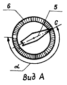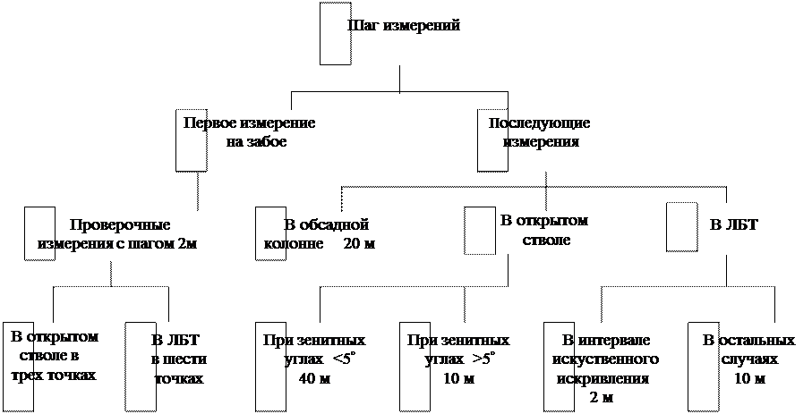 Измерительная часть, показанная на рис. 6, состоит из рамки, ось вращения которой совпадает с осью прибора. Рамка может вращаться вокруг оси в подшипниках 11 и 12. В наклонной скважине рамка под действием эксцентричного груза 1 устанавливается так, что плоскость качания маятника 2 совпадает с апсидальной плоскостью скважины. Связанная с маятником 2 стрелка 3 занимает относительно реохорда 4 положение, зависящее от зенитного угла скважины Q. Магнитная стрелка 5 датчика азимута опирается на острие иглы 7, занимающей всегда вертикальное положение. Это обеспечивается грузом 8, расположенным ниже опоры. Начало кругового реохорда 6 датчика азимута за счет эксцентричного груза 1 всегда располагается в апсидальной плоскости скважины. В верхней части рамки расположен коллектор с тремя контактными кольцами 9 и двумя парами щеток 10. Арретирование магнитной стрелки и отвеса и переключение датчиков на измерение зенитного угла или азимута производится переключающим механизмом, который приводится в действие электромагнитом, находящимся в глубинном приборе и управляемым с поверхности. В процессе спуска и подъема глубинного прибора стрелка отвеса и магнитная стрелка дугами 13 и 14 прижаты к реохордам. При остановке для замера параметров искривления они освобождаются, выдерживаются некоторое время для успокоения, затем вновь прижимаются к реохордам и производится поочередное измерение зенитного угла и азимута путем измерения величины сопротивления реохордов от начала до соответствующей стрелки. Для сокращения затрат времени при измерении в процессе искусственного искривления скважины глубинный прибор инклинометра опускается внутрь колонны бурильных труб. При этом в КНБК включается 24-36 м ЛБТ. Для исключения влияния стальных труб глубинный прибор при измерении должен находится не ближе 5 м от УБТ и 3 м от стальных замков ЛБТ. Шаг измерений инклинометром в различных условиях показан на рис.6. Контроль за измерениями производится путем повторных замеров, перекрытием предыдущих замеров и в особо ответственных случаях двумя инклинометрами.