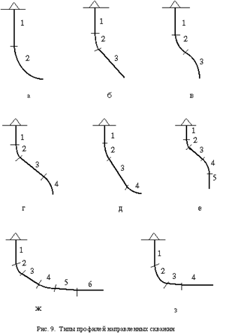 В последнее время все большее распространение получает бурение скважин с горизонтальным участком ствола, что позволяет существенно повысить дебит скважин и нефтеотдачу пластов. В практике буровых работ США такие скважины по типу профиля делятся на четыре категории в зависимости от величины радиуса кривизны при переходе от вертикального участка к горизонтальному (большой, средний, малый и сверхмалый радиусы). Скважины с большим радиусом кривизны имеют интенсивность искривления от 0,6 до 2 град/10 м. С указанными интенсивностями искривления бурится подавляющее большинство наклонно направленных скважин в Западной Сибири. Длина горизонтальной части ствола в этом случае может быть весьма значительной и определяется, главным образом, только сопротивлением продольному перемещению бурильной колонны. Такой тип профиля скважин наиболее подходит для морских месторождений, когда требуется обеспечить добычу из пласта, находящегося на большом расстоянии от платформы. Интенсивность искривления при бурении со средним радиусом кривизны составляет от 2 до 6 град/10 м. Западными фирмами по такому типу профиля бурится подавляющее большинство скважин с горизонтальным участком ствола. Это обусловлено следующим: - многие зоны осложнений могут быть разбурены вертикальным стволом и обсажены; - длина интервалов применения отклонителей существенно меньше, чем для скважин с большим радиусом кривизны; - точка забуривания искривленного ствола располагается ближе к точке вскрытия продуктивного горизонта, что повышает точность попадания в заданный круг допуска. Однако проходка таких скважин требует специального инструмента, вписывающегося в принятый радиус кривизны. Стандартный тип профиля со средним радиусом кривизны (рис. 9, ж) содержит наклонный прямолинейный участок 3, длина которого может меняться для обеспечения попадания ствола в заданную точку. Однако если накоплен значительный опыт бурения таких скважин, то этот участок может быть исключен (рис. 9, з). Интервалы 5 (рис. 9, ж) и 3 (рис. 9, з) имеют интенсивность искривления порядка 1 град/10 м и возникают самопроизвольно вследствие невозможности резкого перехода от криволинейного интервала к прямолинейному даже при применении стабилизирующих компоновок. Длина этих интервалов около 30 м. При бурении с малым радиусом кривизны интенсивность искривления составляет от 4 до 10 град/м, при этом радиус кривизны находится в пределах от 6 до 15 м. Для бурения таких скважин используется специальный инструмент - гибкие бурильные трубы и УБТ, ведутся работы по созданию гибких забойных двигателей. Основное преимущество такого типа профиля - точный подход скважины к выбранному объекту эксплуатации. Однако при этом низка механическая скорость бурения, отсутствует серийная забойная аппаратура для контроля за положением ствола скважины, и сравнительно невелика длина горизонтального участка. Очевидно, что для более широкого внедрения такого типа профиля требуются дополнительные научные исследования и конструкторские разработки. Для получения сверхмалых радиусов кривизны (от нескольких сантиметров до 0,6 м) используются высоконапорные струи воды, с помощью которых создаются стволы диаметром 40 - 70 мм. Этот метод пока применяют только в экспериментальных целях. Скважины с горизонтальным участком ствола, 