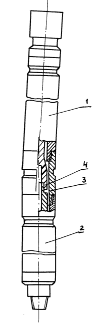 Преимуществами турбинных отклонителей являются приближение кривого переводника к забою скважины, в результате чего искривление ствола имеет более стабильный характер, мало зависящее от физико-механических свойств пород и технологии бурения. Использование нескольких турбинных секций (отклонители серии ОТС) позволяет увеличивать мощность и крутящий момент на долоте и применять такие отклонители в скважинах малого диаметра, т. е. там, где обычные кривые переводники не дают желаемых результатов. Существенным недостатком турбинных отклонителей является малый моторесурс кулачкового шарнира, соединяющего валы шпиндельной и турбинной секций. Этого недостатка в некоторой степени лишены шпиндель-отклонители (рис. 14), у которых кривой переводник 1 включен в разъемный корпус 2 шпинделя, а вал изготавливается составным, соединенным кулачковыми полумуфтами 3. Такая конструкция отклонителя позволяет разгрузить полумуфты от гидравлических нагрузок и увеличить долговечность узлов по сравнению с турбинными отклонителями. Шпинтель-отклонители можно эксплуатировать вместо обычного шпинделя с любым секционным турбобуром. Угол перекоса кривого переводника серийно выпускаемых шпиндель-отклонителей составляет 1О 30', а наружный диаметр - 195 и 240 мм. За счет приближения кривого переводника к забою повышается отклоняющая способность и стабильность искривления скважины.