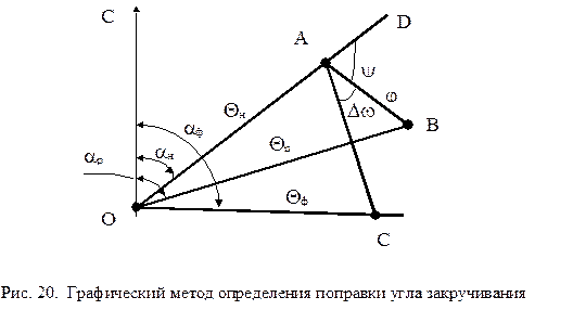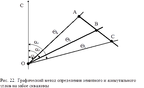 Однако, как указывалось ранее, угол закручивания инструмента зависит от многих факторов, поэтому фактическое его значение зачастую весьма существенно отличается от принятого. В связи с этим в процессе искусственного искривления скважины производится определение фактического угла закручивания. При этом, как правило, используется графический метод. Для этого после бурения с отклонителем определенного интервала, например, 40 м, производится замер фактического зенитного угла и азимута скважины. Далее от условного направления, принятого за северное, откладывается азимутальный угол скважины в начале интервала искривления aн , а по полученному направлению в принятом линейном масштабе, например, 1О = 1 см, откладывается начальный зенитный угол Qн (точка А, рис. 20). В точке А от направления АD по часовой стрелке откладывается угол установки отклонителя y, а по полученному направлению в принятом линейном масштабе - угол пространственного искривления скважины j на пробуренном интервале. Этот угол определяется по формуле j = i . h, (65) где i - интенсивность искусственного искривления для используемого отклонителя, град/м (определяется из технической характеристики отклонителя); h - длина пробуренного интервала, м. Полученная точка В соединяется с точкой О, при этом углы aр и Qр являются расчетными для пробуренного интервала. Затем в точке О от направления на север откладывается фактический (замеренный) азимут aф и по полученному направлению в принятом линейном масштабе фактический зенитный угол скважины Qф . Полученный угол ВАС является поправкой к углу закручивания инструмента, принятого по табл. 1 или 2. Эта поправка берется со знаком плюс, если фактический азимут меньше расчетного, и со знаком минус, если aф > aр . В случае, если точки А, В и С окажутся на одной прямой, но В и С не совпадают, то это свидетельствует о том, что фактический угол закручивания инструмента равен принятому, но фактическая интенсивность искусственного искривления для используемого отклонителя отличается от указанной в технической характеристике. После определения величины поправки угла закручивания инструмента необходимо произвести корректировку угла установки отклонителя путем поворота колонны бурильных труб. Для более точного откладывания углов на неподвижной части ротора необходимо перевести их значения в градусах в длину дуги окружности S стола ротора по формуле S = r . a/ 57,3, (66) где r - радиус стола ротора; a - откладываемый угол. Длина дуги измеряется стальной рулеткой. В наклонном стволе используется косвенный метод ориентирования, основанный на определении положения плоскости действия отклонителя относительно апсидальной плоскости скважины. Это существенно снижает затраты времени и повышает точность ориентирования отклонителя. В компоновку низа бурильной колонны включается так называемый магнитный переводник, представляющий собой обычный переводник, во внутренней боковой поверхности которого встроен постоянный магнит. Создаваемый им магнитный поток имеет то же направление действия, что и направление действия отклонителя. При ориентировании внутрь колонны бурильных труб опускается инклинометр с магнитной буссолью, например, типа КИТ. Разрыв реохорда (начало отсчета) буссоли инклинометра за счет эксцентричного груза рамки датчиков в наклонной ск