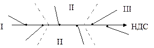 При бурении скважин с кустовых площадок в связи с тем, что устья скважин располагаются близко друг к другу, возможны тяжелые аварии, связанные с пересечением стволов двух скважин. Для предотвращения этого явления при проектировании необходимо учитывать ряд дополнительных факторов. Основной принцип проектирования состоит в том, что в процессе бурения стволы скважин должны отдаляться друг от друга. Это достигается, во-первых, оптимальным направлением движения станка (НДС) на кустовой площадке, во-вторых, соответствующей очередностью разбуривания скважин и, в-третьих, безопасной глубиной зарезки наклонного ствола. Наиболее оптимальным вариантом бурения с кустовой площадки является такой, при котором направления на проектные забои скважин близки к перпендикулярным по отношению к НДС, а совпадение НДС и направлений на проектные забои нежелательно и должно быть минимальным (рис. 24).