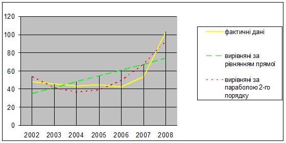 Рис.1. Динаміка зміни валової продукції на 100 га с.-г. угідь Аналізуючи проведені розрахунки можна сказати, що найкращим чином зміну динаміки валової продукції на 100 га с.-г. угідь в СПТ «Урожай» Братського району за 2002-2008 роки відображає рівняння параболи, тому що в цьому випадку сума квадратів відхилень найменша. 3.2 Кореляційний аналіз залежності виробництва валової продукції рослинництва від енерго- та фондозабезпеченості в СПТ «Урожай» Братського району Кореляційною називається залежність при які кожному значенню факторної ознаки не завжди відповідає строго визначене значення результату. Саме цим кореляційний зв’язок відрізняється від функціонального. Кореляційний зв’язок проявляється лише в середньому і тому він називається неповною статистичною залежністю. Розрізняють форми зв’язку прямі та зворотні. Прямий зв’язок – це такий зв’язок при якому із збільшенням факторної ознаки результативність також збільшується. Зворотний зв’язок – це, коли факторна ознака збільшується результативність зменшується. [15] Крім того по своєму математичному вираженню вони бувають прямо та криволінійними.