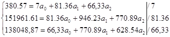 2882,4=10,059а2 ; а2 = 286,5; 3000=а1 +10*286,5; а1 =135; 2081,5=а0 +10,4286*135+9,4757*286,5 а0 =-2041,1; Модель рівняння залежності виходу валової продукції від фондозабезпеченості та енергозабезпеченості має такий вигляд: