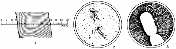Рис. 2. Сравнительная величина волоса и бактерий: 1 — увеличенное изображение волоса (X 500);2 — бактерии в поле зрения светового микроскопа (X 2000); 3 — бактерии под электронным микроскопом (X 20 000). Крайне малые размеры клеток являются характерной, но не главной особенностью бактерий. Все бактерии представлены особым типом клеток, лишенных истинного ядра, окруженного ядерной мембраной. Аналогом ядра у бактерий является нуклеоид — ДНК-содержащая плазма, не отграниченная от цитоплазмы мембраной. Кроме того, для бактериальных клеток характерны отсутствие митохондрий, хлоропластов, а также особое строение и состав мембранных структур и клеточных стенок. Организмы, в клетках которых отсутствует истинное ядро, называются прокариотами (доядерными) илипротоцитами (т. е. организмами с примитивной организацией клеток). Бактерии, в широком смысле слова, — это прокариотные организмы. К прокариотам относятся такие группы микроорганизмов, как эубактерии, спирохеты, микоплазмы, миксобактерии, лучистые грибки (актиномицеты) и сине-зеленые водоросли (цианобактерии). Форма клеток у бактерий может быть не только палочковидной (цилиндрической), но и шаровидной (кокки), спиральной (вибрионы, спириллы, спирохеты). Актиномицеты же и родственные им организмы образуют длинные ветвящиеся клетки — гифы, формирующие мицелий (сплетение гиф). Клетки микоплазм, лишенные плотной оболочки, способны принимать самые причудливые, постоянно изменяющиеся формы. Первооткрывателем мира бактерий был Антоний Левенгук — голландский естествоиспытатель XVII в., впервые создавший совершенную лупу-микроскоп, увеличивавший предметы в 160-270 раз. Со времен Левенгука техника исследования микробиологических объектов шагнула далеко вперед. Созданы световые микроскопы, увеличивающие объекты в 2000 и более раз. С помощью современного электронного микроскопа, увеличивающего предметы в 200 000 — 500 000 раз, можно различать и изучать самые мелкие микроорганизмы. Для сравнения на рисунке 2 показаны размеры волоса в микрометрах, изображение бактерии, полученное в световом микроскопе, и часть той же бактерии в поле зрения электронного микроскопа. Вооруженная усовершенствованными приборами, микробиология все глубже и полнее познает свойства и особенности мира невидимых. Ученые-микробиологи разрабатывают новые методы наилучшего использования полезных микробов и пресечения деятельности вредных. Разработанный русским микробиологом С. Н. Виноградским метод выращивания микробов в лабораториях на элективных (избирательных) питательных средах дал возможность более подробно изучить различные микроорганизмы и их распространение в природе. Используя этот метод, ученые установили, что бактерии обнаруживаются всюду: в каждой капле даже самой чистой воды, в крупинках почвы, в воздухе, на скалах Земли Франца-Иосифа и в снегах полярных областей, в океане на Северном полюсе. Разнообразные виды бактерий найдены также в почвах пустыни Сахара, в грунте, взятом со дна океана на глубине 4 км, и в нефти, добытой из глубоко залегающих нефтяных пластов. Бактерии способны жить даже в воде горячих источников с температурой около 80° С. Благодаря ничтожным размерам бактерии легко проникают в трещины, щели, поры. Они очень выносливы и приспособлены к неблагоприятным условиям существования: переносят высуш