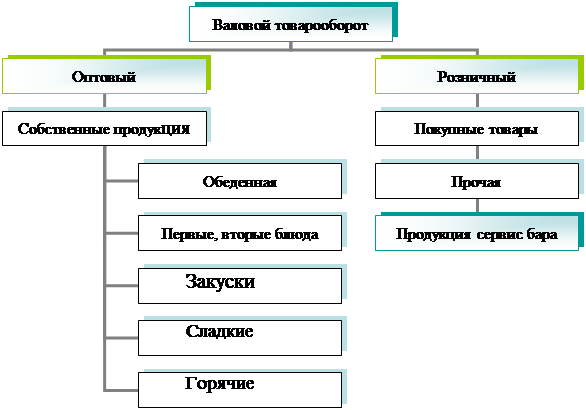 При разработке плана по реализации покупных товаров в ассортименте необходимо предусматривать увеличение продажи овощей, фруктов, безалкогольных напитков, кондитерских изделий и снижение реализации вино-водочных и табачных изделий. Планирование ассортимента покупных товаров зависит от спроса потребителей, а также от типа и профиля, входящих в состав предприятия филиалов (ресторанов, кафе, и т.д.), так как состав ассортимента покупных товаров должен дополнять и расширять ассортимент продукции собственного производства. 7. Пути роста товарооборота общественного питания в современных условиях Заключительным этапом изучения вопросов прогнозирования товарооборота является формирование основных направлений его развития на предприятиях общественного питания в рыночных условиях. Главное внимание уделяется улучшению торговой деятельности предприятий общественного питания, повышению уровня обслуживания. Основными путями роста товарооборота общественного питания в современных условиях являются; • совершенствование ассортимента и качества выпускаемой продукции и услуг с целью удовлетворения более широкого спектра потребностей различных групп потребителей, удешевления питания; • поиск новых источников сбыта, в частности, за счет расширения оптового отпуска продукции в розничную торговую сеть; • реконструкция и перепрофилирование действующих предприятий, восстановление деятельности ранее закрытых предприятий, развитие сети объектов общественного питания в местах интенсивных покупательских потоков потребителей (на рынках, автотрассах и т.д.); • активное продвижение продукции общественного питания на рынок (организация выставок-продаж, других массовых мероприятий, реклама, оказание дополнительных услуг, повышение качества обслуживания); • усиление социальной направленности деятельности предприятий общественного питания за счет развития сети столовых и буфетов при учебно-образовательных учреждениях, на производственных предприятиях, в хозяйствах; • расширение и открытие сети магазинов и отделов кулинарии, организация столов заказов, бюро добрых услуг; • открытие мини-производств при крупных торговых центрах, универмагах, универсамах, продовольственных магазинах; • развитие сезонной торговли пивом, квасом, соками и другой продукцией. Литература 1)Гражданский кодекс РФ ч.1,2 1995г. 2)Налоговый кодекс РФ ч.1 2000г., ч.2 2001г. 3)Закон РФ “О потребительской кооперации в РФ” от 11.07.1997г. №97 ФЗ, изменения и дополнения №54 ФЗ 2000г. 4)Постановление 119 общего Собрания представителей потребительских обществ РФ: О социально-экономическом положении и Программе стабилизации и развития потребительской кооперации на 1998-2002г. от 30 июня 1998г. М.1998г. 5)Концепция развития потребительской кооперации на период до 2010г. Москва 2001г. 6)Фридман ”Экономика торговой деятельности потребительского общества” 1994г. 7)Александров “Экономика торгового предприятия” Красноярск 2002 1 и 2 часть. 8)Игонина “Анализ и планирование показателей в общественном питании” учебное пособие Мытищи 2001г. 9)Емельянова “Экономика общественного питания” Минск 2004г. Приложение. Схема “Классификация товарооборота предприятий общественного питания”.